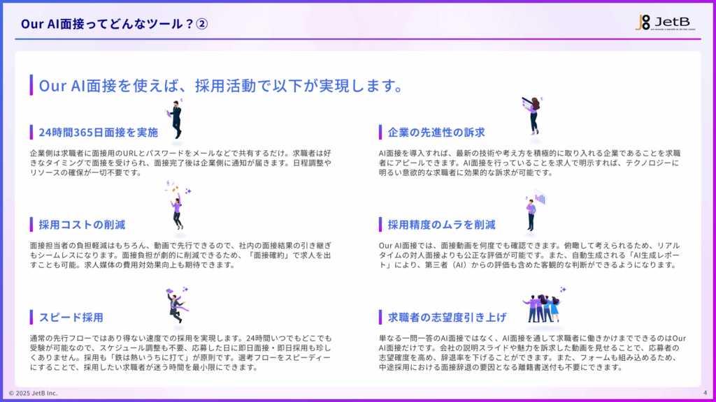 トップ > AI面接資料 > サービス資料 – 3分でわかる『Our AI面接』 AI面接資料 サービス資料 – 3分でわかる『Our AI面接』 無料で資料を受け取る この資料でわかること Our AI面接の概要 Our AI面接の導入で解決できる課題 Our AI面接の導入で削減できたコストや得られた利益の事例 Our AI面接の費用感
